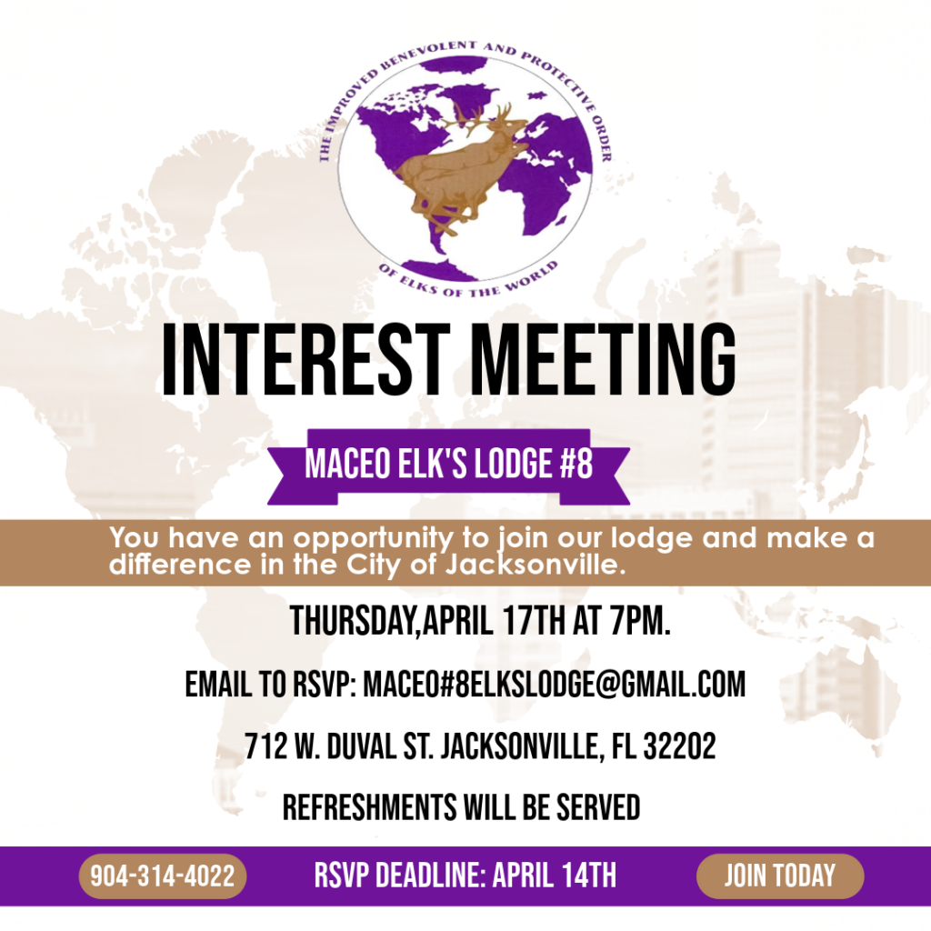 Calling on our civic minded brothers interested in learning more about Maceo #8 Elk. Now’s your chance to get your questions answered and join the brotherhood that’s making a difference in Jacksonville.